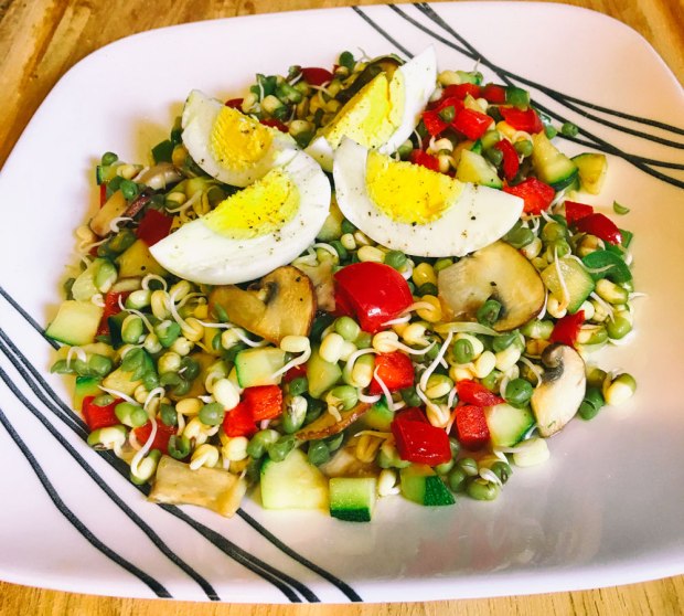 One of my favorite salads is the sprouted lentil salad with lots of vegetables that is very quick and easy to make.