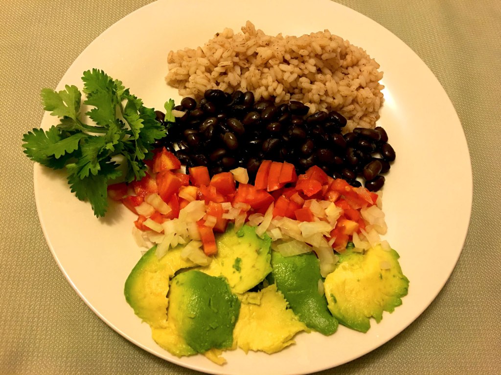 - Place the rice, black beans, avocado, tomato, onion on a serving plate, sprinkle lemon juice. Decorate with fresh cilantro n enjoy !
