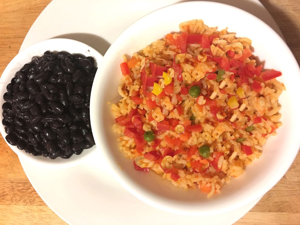 Place the rice, black beans on a serving bowl.