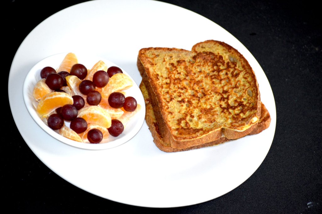 - Dip the bread into the mixture and toast both sides till golden brown. Serve toast with your choice of fruits. Enjoy!